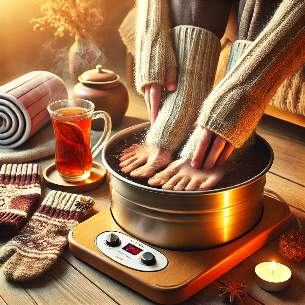 약 40도의 따뜻한 물에 발을 담그면 체온이 빠르게 올라가며, 물에 소금을 약간 넣으면 더 큰 효과를 기대할 수 있습니다.
